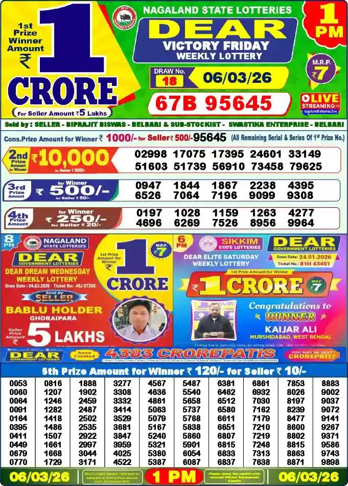 Check the Dear Lottery Day Result in PDF for March 06, 2026, at লটারী সংবাদ 6 PM draw, Sikkim state.