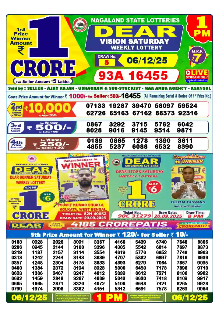 Check the Dear Lottery Day Result in PDF for December 06, 2025, at লটারী সংবাদ 6 PM draw, Sikkim state.