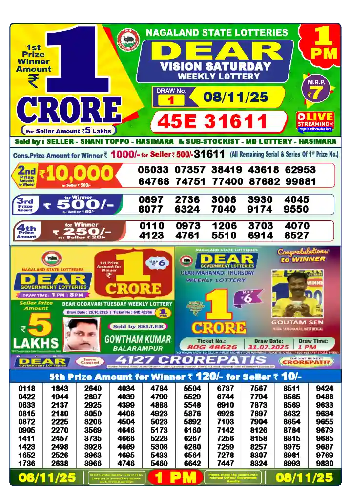 Check the Lottery Sambad results for Saturday, November 08, 2025, at 1 PM, 6 PM, and 8 PM. You can also find the Dear Lottery outcomes dated 08/11/25 and watch them live online. You can always find the results of past draws in Lottery Sambad Old.