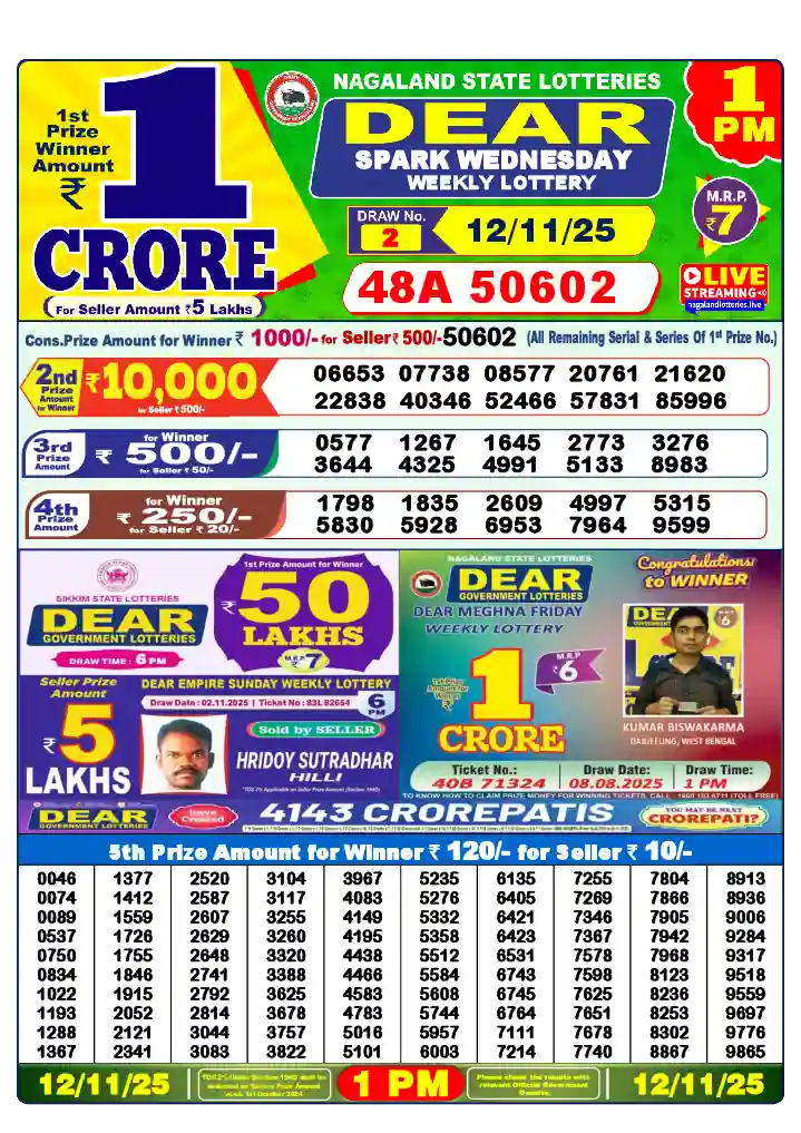 Check the Nagaland State Lottery results for Wednesday, November 12, 2025, at 1 PM, 6 PM, and 8 PM. You can also find the Dear Lottery outcomes dated 12/11/25 and watch them live online. You can always find the results of past draws in Lottery Sambad Old.