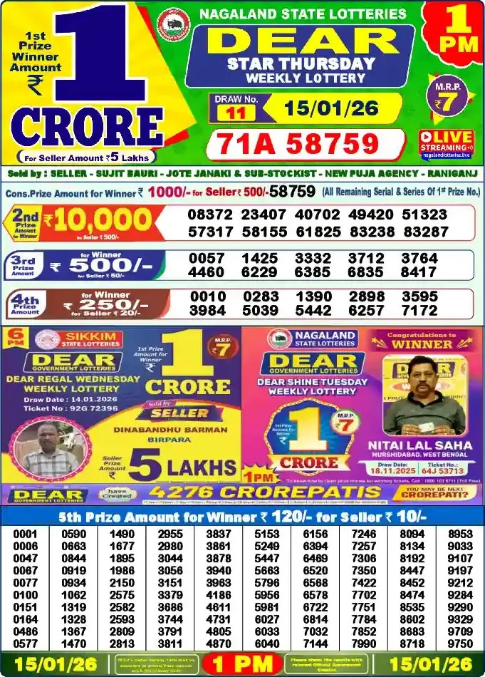 Check Nagaland Lottery Sambad results for 15 January 2026 at 1PM, 6PM, and 8PM. View Dear Lottery results for 15/01/26 and browse Old Lottery Sambad Result for past draws.
