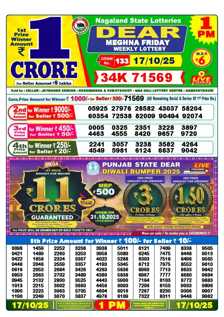 Nagaland Lottery Draw Live 17.10.25 1PM