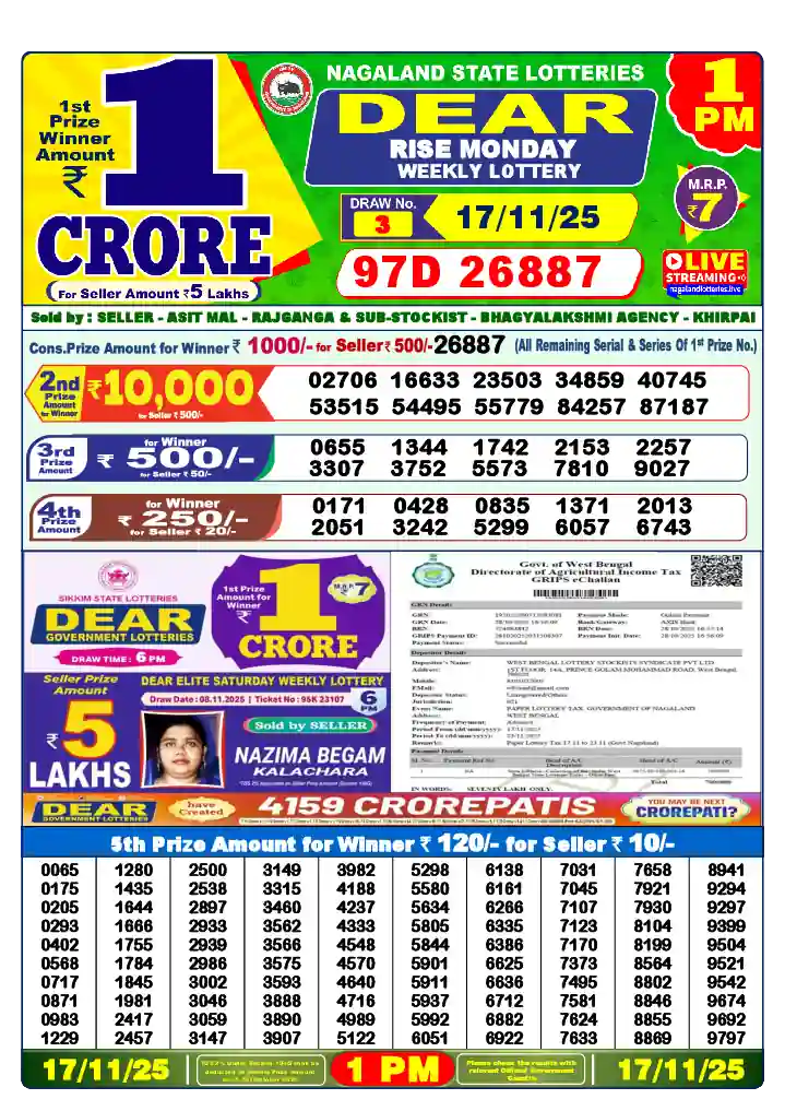 Check the Nagaland Lottery results for Monday, November 17, 2025, at 1 PM, 6 PM, and 8 PM. You can also find the Dear Lottery outcomes dated 17/11/25 and watch them live online. You can always find the results of past draws in Lottery Sambad Old 8pm.