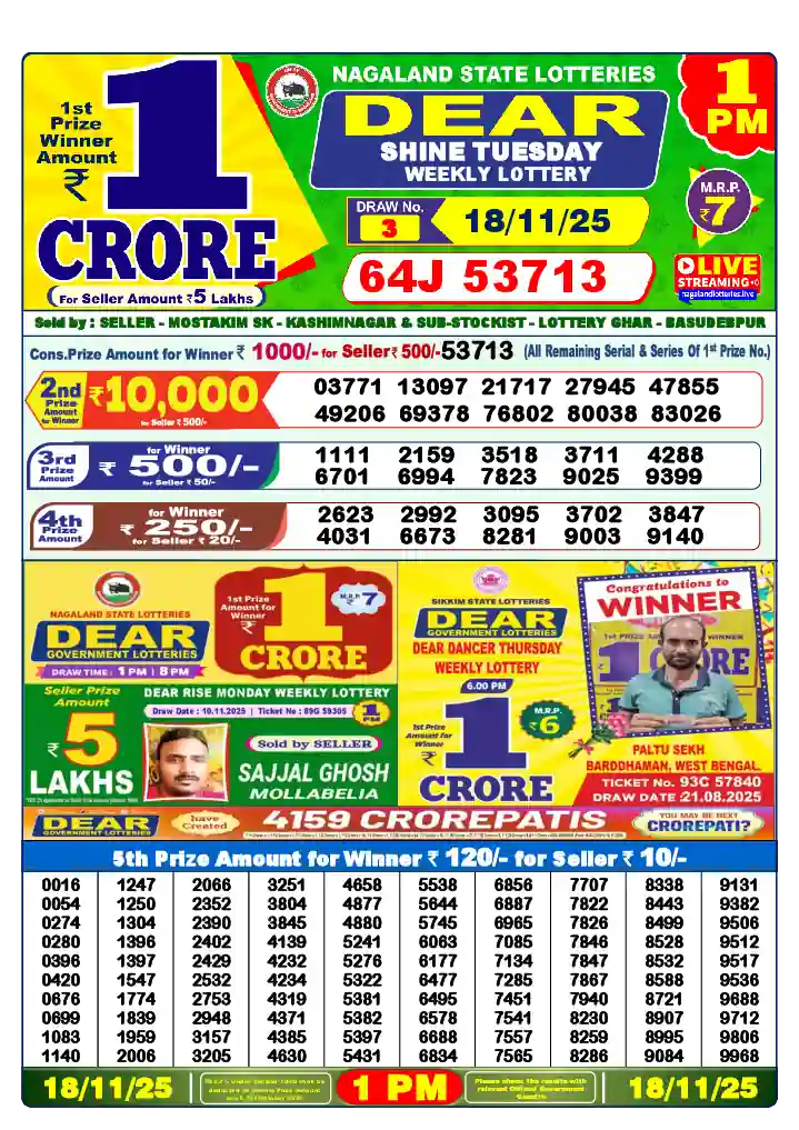 Check the Lottery Sambad Morning Result in PDF for November 18, 2025, at লটারি সংবাদ 1 PM draw, Nagaland.