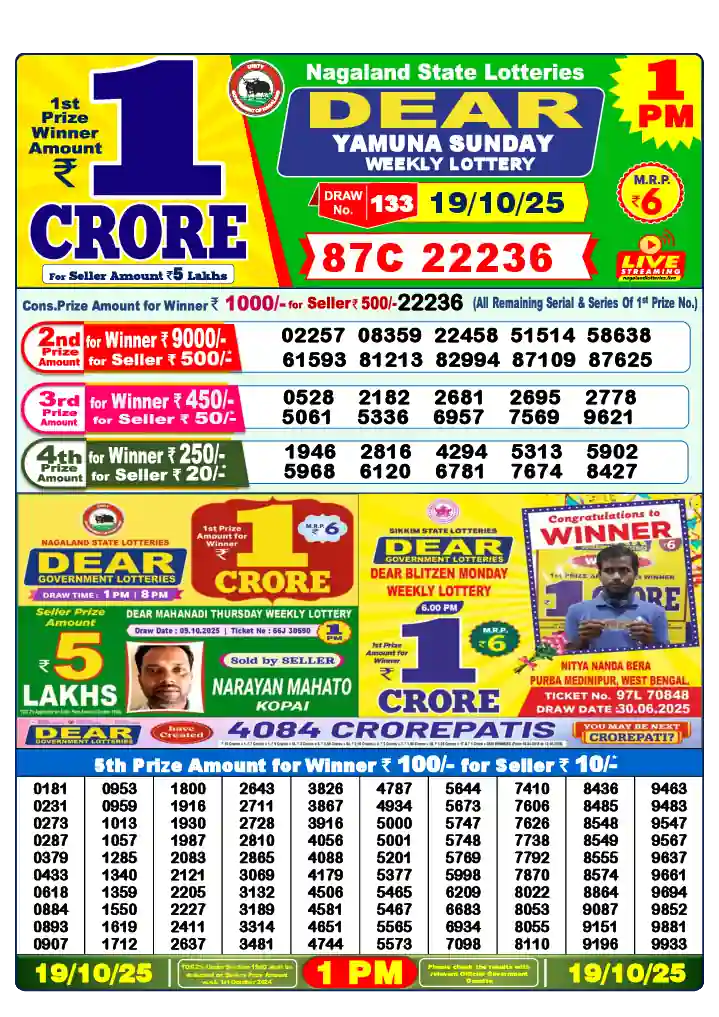 Dear Lottery Result 19/10/25