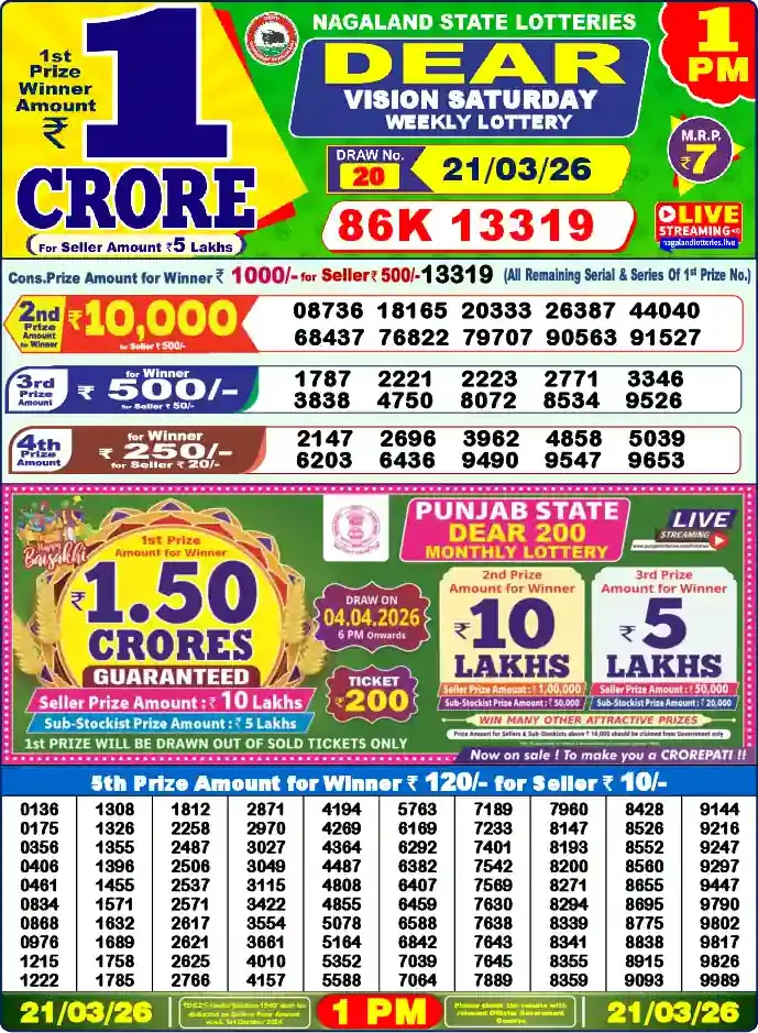 Nagaland Lottery Draw Live 21.03.26 1PM