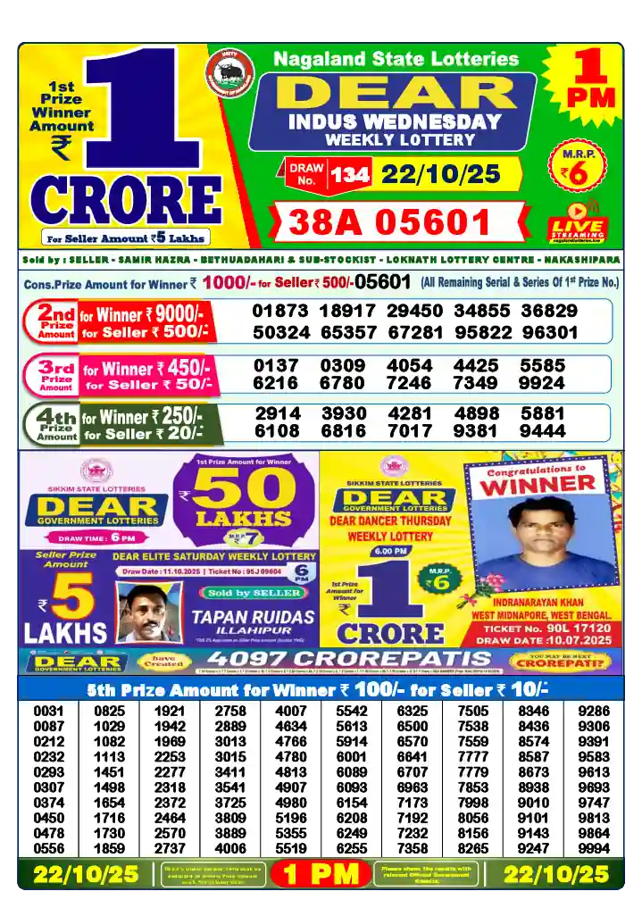 Check the Today Lottery Result results for Wednesday, October 22, 2025, at 1 PM, 6 PM, and 8 PM. You can also find the Dear Lottery outcomes dated 22/10/25 and watch them live online. You can always find the results of past draws in Old Lottery Sambad.