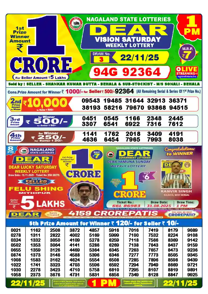 Check the Dear Lottery Sambad results for Saturday, November 22, 2025, at 1 PM, 6 PM, and 8 PM. You can also find the Dear Lottery outcomes dated 22/11/25 and watch them live online. You can always find the results of past draws in Today Lottery Sambad Old.