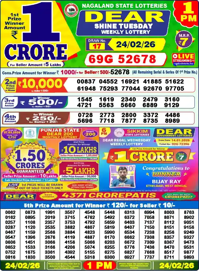 Check Nagaland Lottery results for 24 February 2026 at 1PM, 6PM, and 8PM. View Dear Lottery results for 24/02/26 and browse Lottery Sambad Old for past draws.