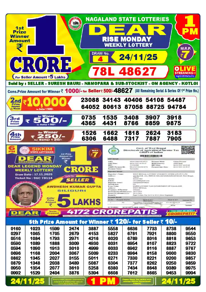 Check the Dear Lottery Result results for Monday, November 24, 2025, at 1 PM, 6 PM, and 8 PM. You can also find the Dear Lottery outcomes dated 24/11/25 and watch them live online. You can always find the results of past draws in Old Lottery Sambad.