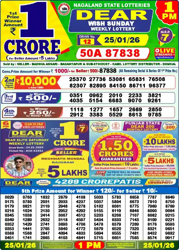 Check Lottery Sambad results for 25 January 2026 at 1PM, 6PM, and 8PM. View Dear Lottery results for 25/01/26 and browse Nagaland State Lottery Old for past draws.
