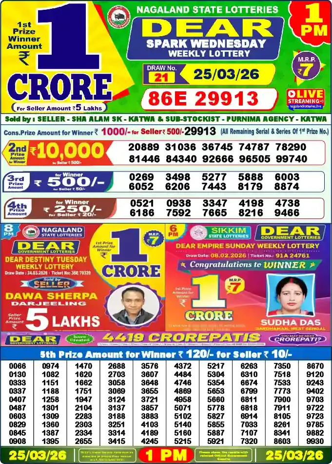 Check the Dear Lottery Day Result in PDF for March 25, 2026, at লটারী সংবাদ 6 PM draw, Sikkim state.