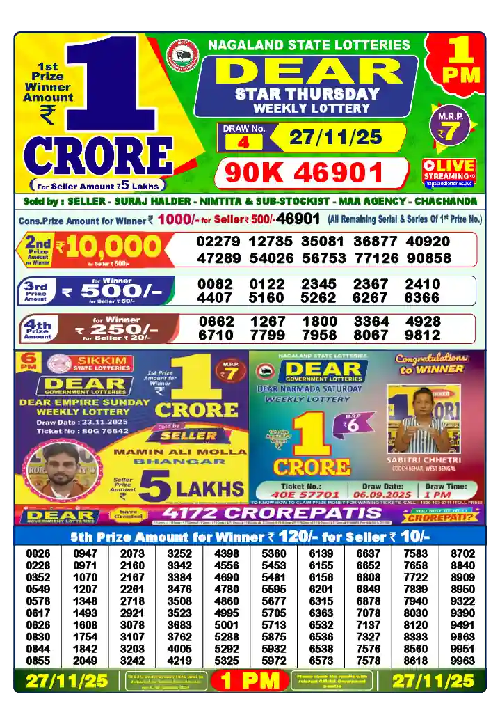 Check the Dear Lottery results for Thursday, November 27, 2025, at 1 PM, 6 PM, and 8 PM. You can also find the Dear Lottery outcomes dated 27/11/25 and watch them live online. You can always find the results of past draws in Old Lottery Sambad.