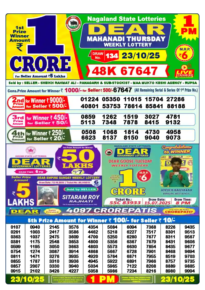 Check the Dear Lottery Day Result in PDF for October 23, 2025, at লটারী সংবাদ 6 PM draw, Sikkim state.