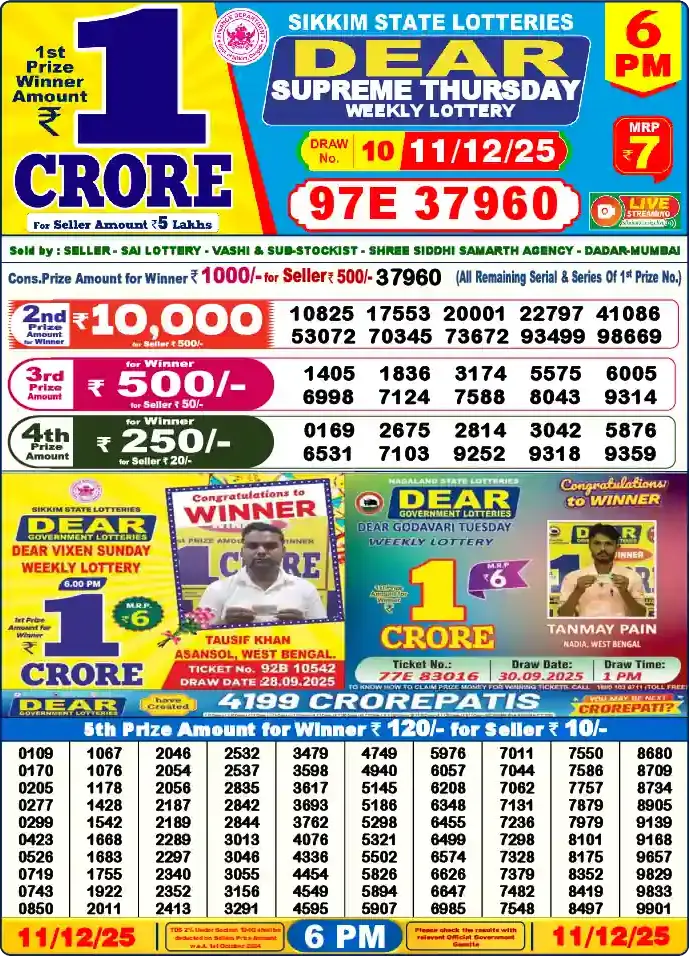DEAR Lottery 6pm ka - Check your Lottery Sambad ticket, Sambad morning Lottery Result for Today December 11, 2025 Sikkim state time লটারি সংবাদ 6:00 PM.