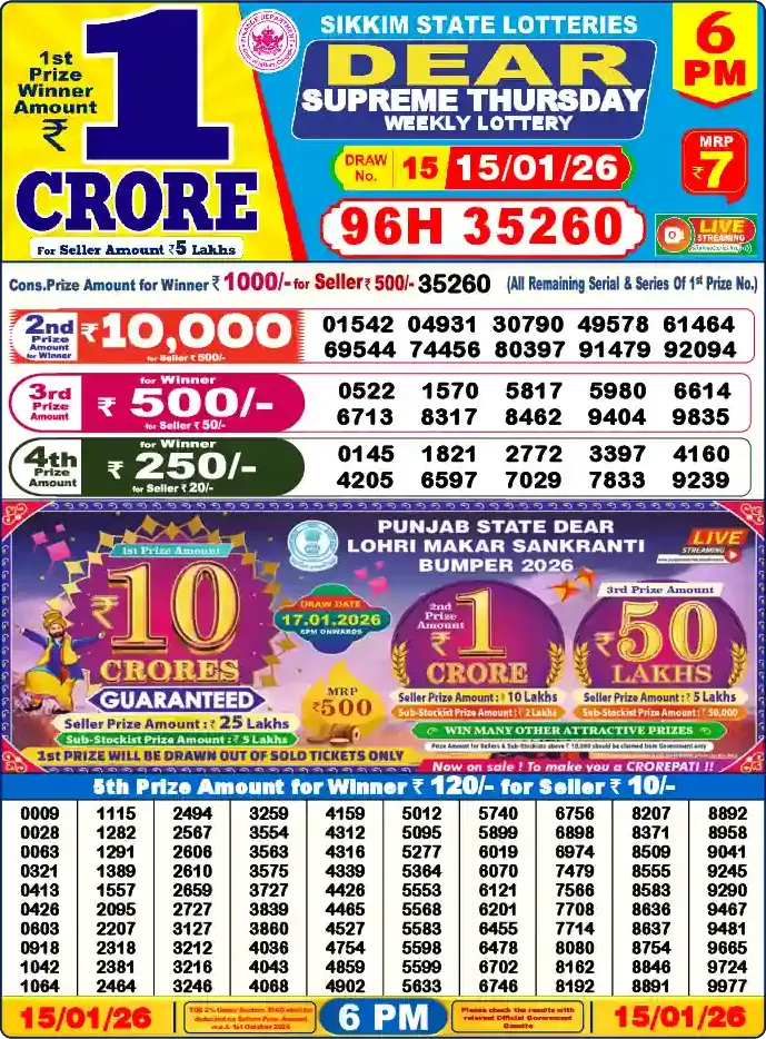 This page shows the Lottery Sambad 6PM result for 15/01/26 (Sikkim State Lotteries). To avoid mistakes, always match both parts of your ticket: the series (letters) and the number. Many near-matches happen when players check only the last digits.