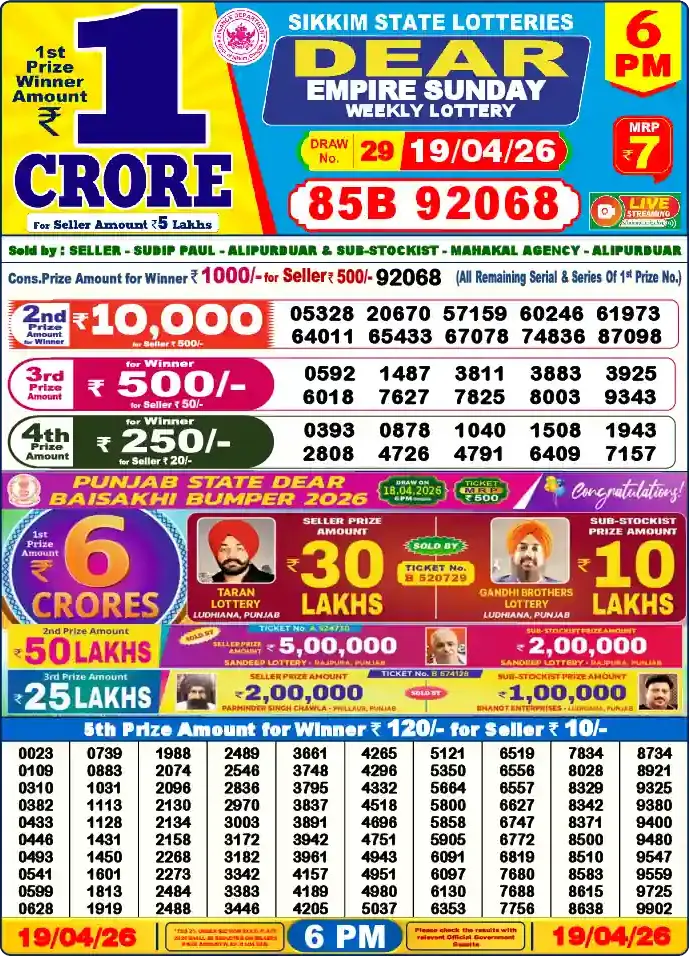 This page shows the Lottery Sambad 6PM result for 19/04/26 (Sikkim State Lotteries). To avoid mistakes, always match both parts of your ticket: the series (letters) and the number. Many near-matches happen when players check only the last digits.