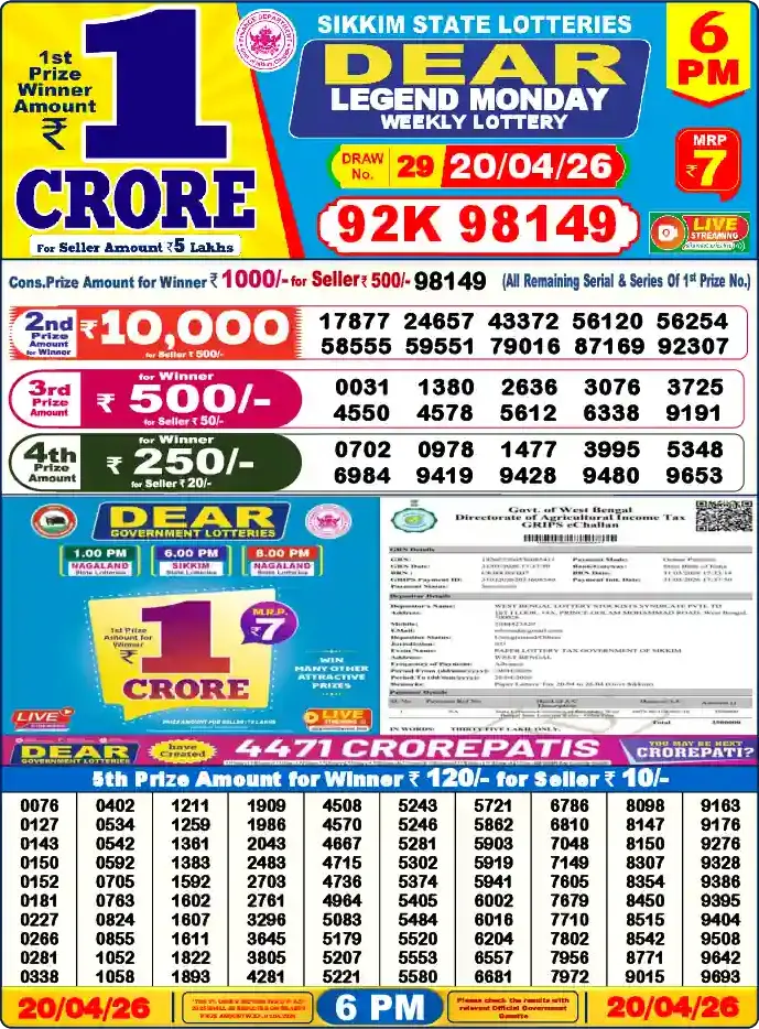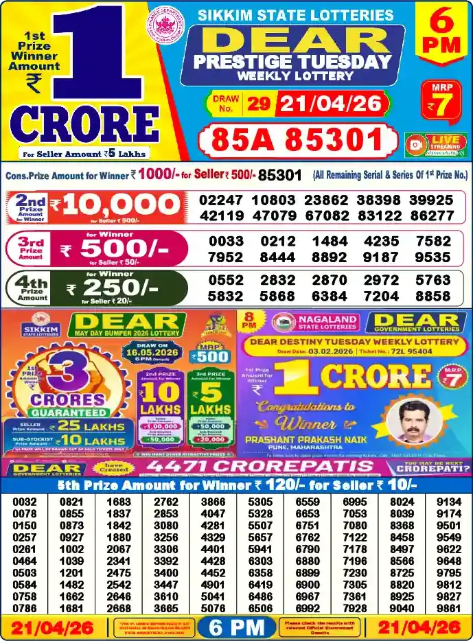 Lottery Sambad 6PM result for 20.04.2026 (Nagaland State Lottery). Check your Dear Lottery ticket series and number, then download the official PDF when available.