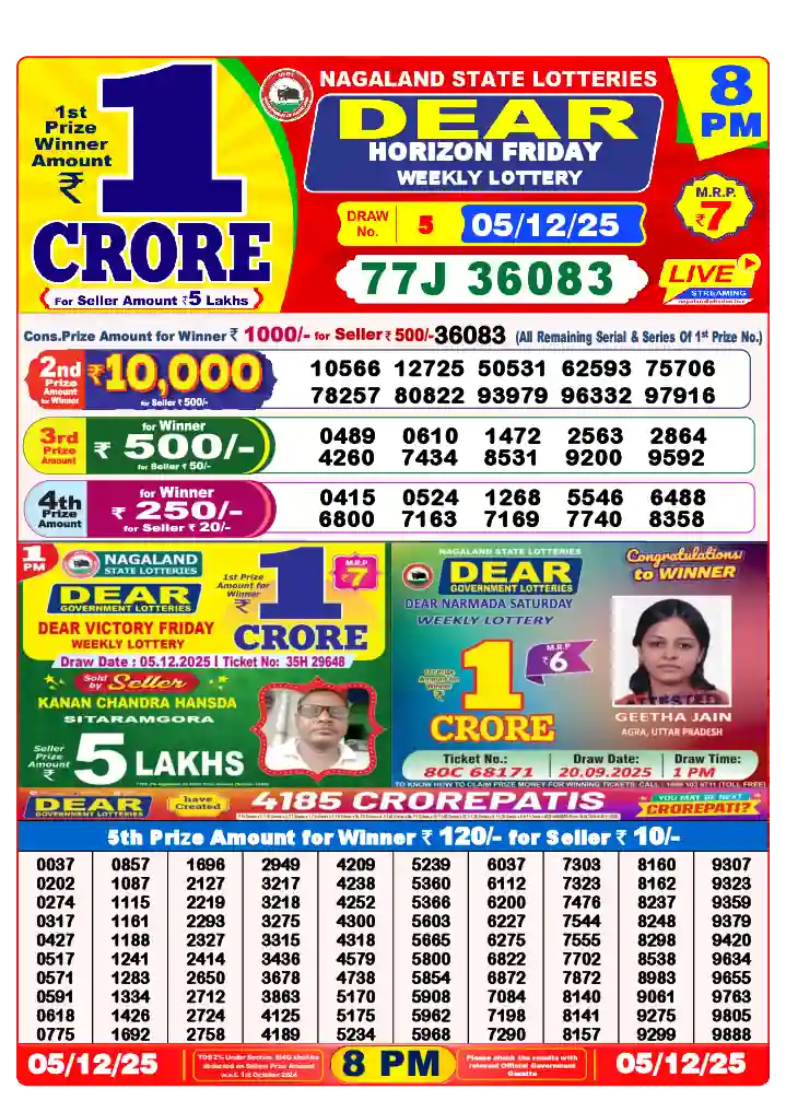 DEAR Lottery 8pm ka - Check your Lottery Sambad ticket, Sambad morning Lottery Result for Today December 06, 2025 Nagaland state time লটারি সংবাদ 8:00 PM.