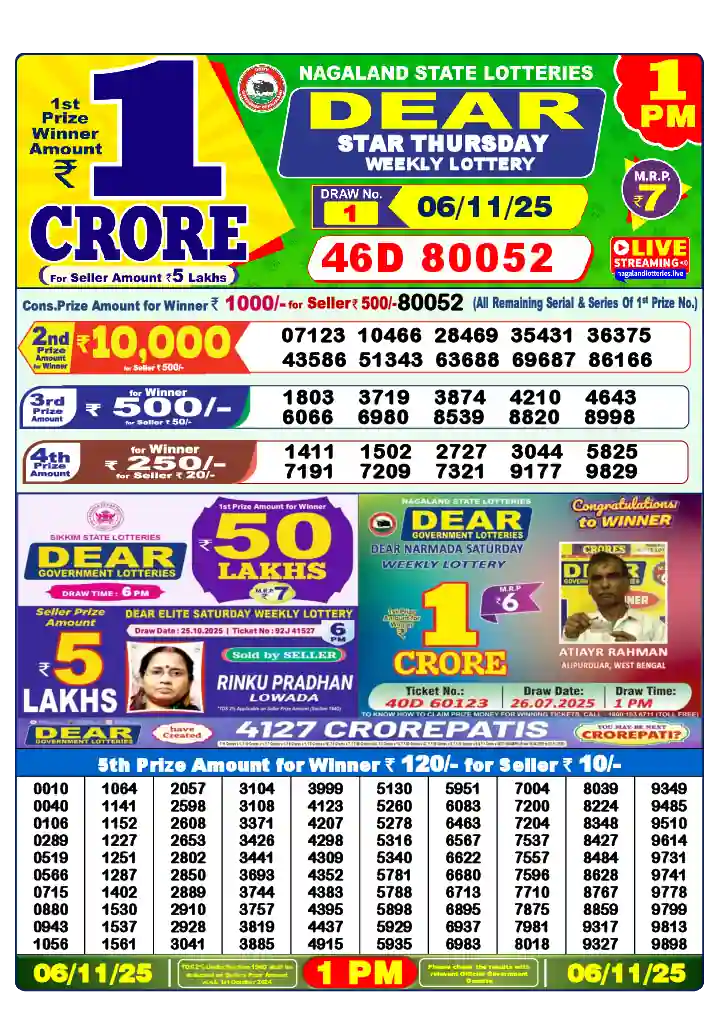 DEAR Lottery 1pm ka - Check your Lottery Sambad ticket, Sambad morning Lottery Result for Today November 07, 2025 Nagaland state time লটারি সংবাদ 1:00 PM.