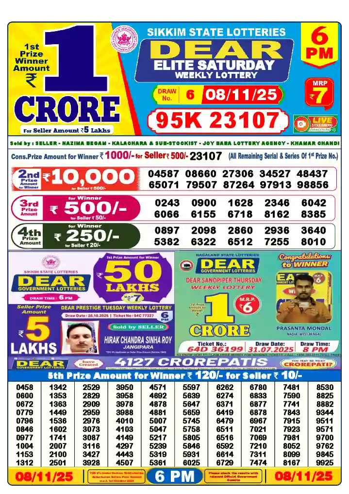 DEAR Lottery 6pm ka - Check your Lottery Sambad ticket, Sambad morning Lottery Result for Today November 08, 2025 Sikkim state time লটারি সংবাদ 6:00 PM.