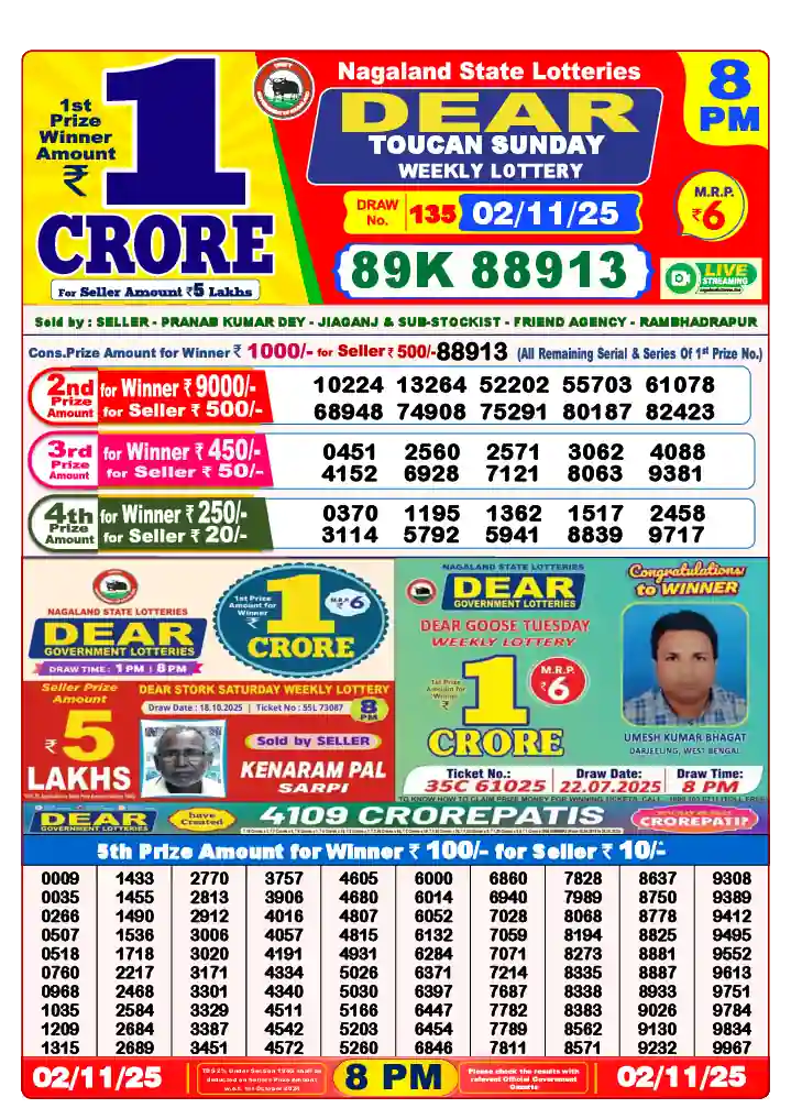 DEAR Lottery 8pm ka - Check your Lottery Sambad ticket, Sambad morning Lottery Result for Today November 03, 2025 Nagaland state time লটারি সংবাদ 8:00 PM.